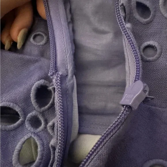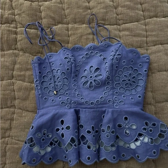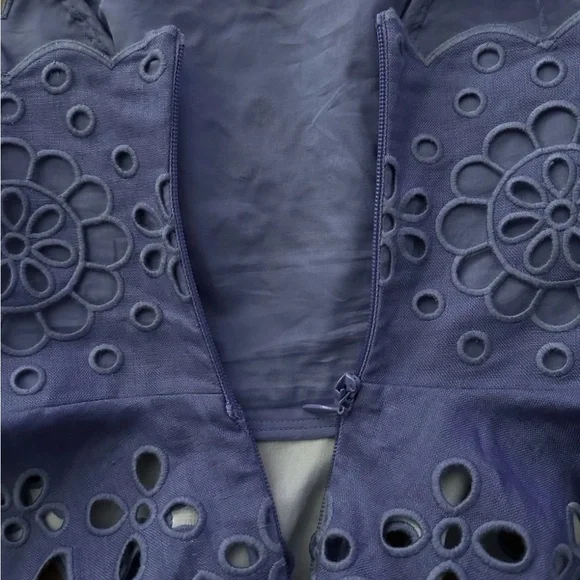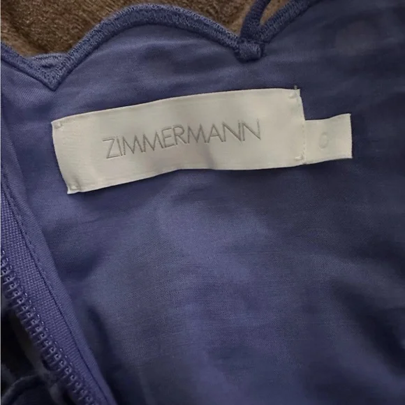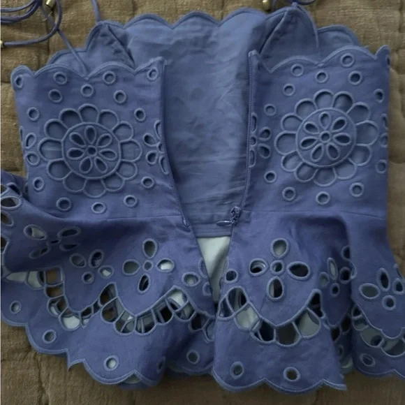 Zimmermann Pop Broderie Angelaise Purple Top - 0/XS. Top is brand new never worn however the zipper is fully damaged and will need to be replaced which in my experience costs about $40. Size chart included in images but in my personal opinion I find that Zimmermann runs small since it is an Australian brand. Original price was $595.